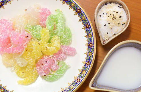 Tapioca and rice flour with coconut milk and sugar made into little food colored morsels and sprinkled with shredded coconut